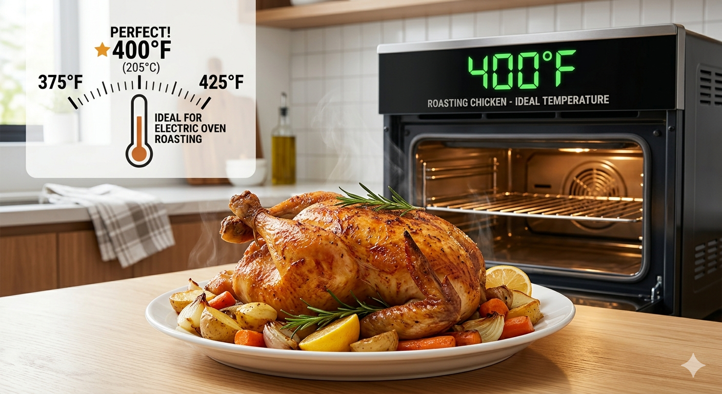Bezpečnosť potravín vyžaduje vnútornú teplotu 165 °F , bez ohľadu na použitú teplotu rúry. Zatiaľ čo praženie pri 400 °F je „sladké miesto“ pre textúru, teplota pece je len prostriedkom na dosiahnutie bezpečného vnútorného cieľa. V elektrickej rúre musíte byť opatrní s veľkými vtákmi (nad 5 libier); môžu vyžadovať nižšiu teplotu 375 °F, aby sa zabezpečilo, že sa stred prepečie skôr, ako sa pokožka spáli.